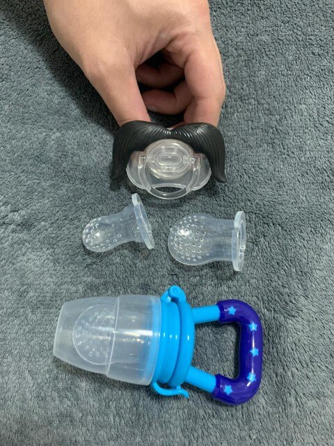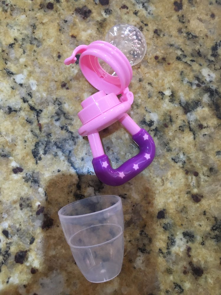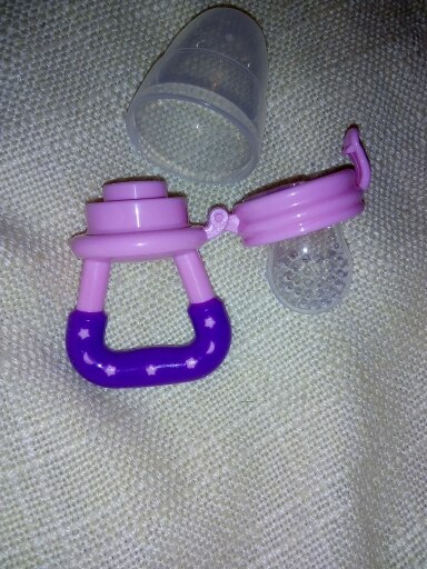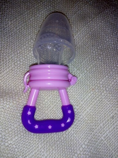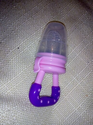 Got this for my 5 month old who just started trying food and has been teething since 3 months with no progress. I used the smallest one with frozen blueberries and she loved it. She can hold it herself with little help and I love that it can be cleaned very easily. We had a mesh feeder and tossed it because it is so hard to clean really well and just gets floppy and gross when the food thaws. This is a much better alternative and great price. My only concern is that the nipple piece can be removed too easily but hasn’t caused any issues yet.