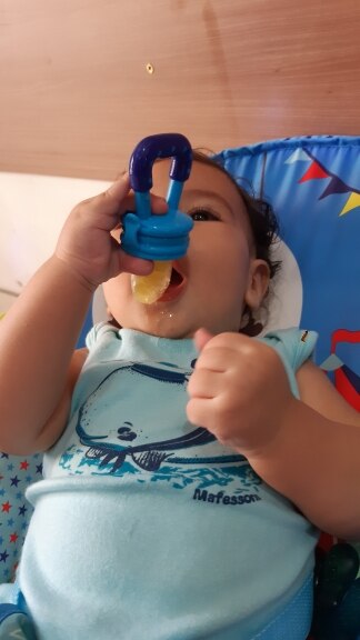 Our 8 month old son is teething really badly (all 4 front teeth at once) and wont eat anything. That all changed when we introduced this teether. We have given him cold oranges, peaches, blueberries, and strawberries much to his liking. At first he would only chew on it when we held the teether for him, but now (1 week later) he is able to hold it himself to adjust the position to his liking. Love that it comes with several inserts as it allows us to change up the fruits during each feeding without stopping to clean. Only complain is one of the teether inserts has turned yellow/orange after the very first use.