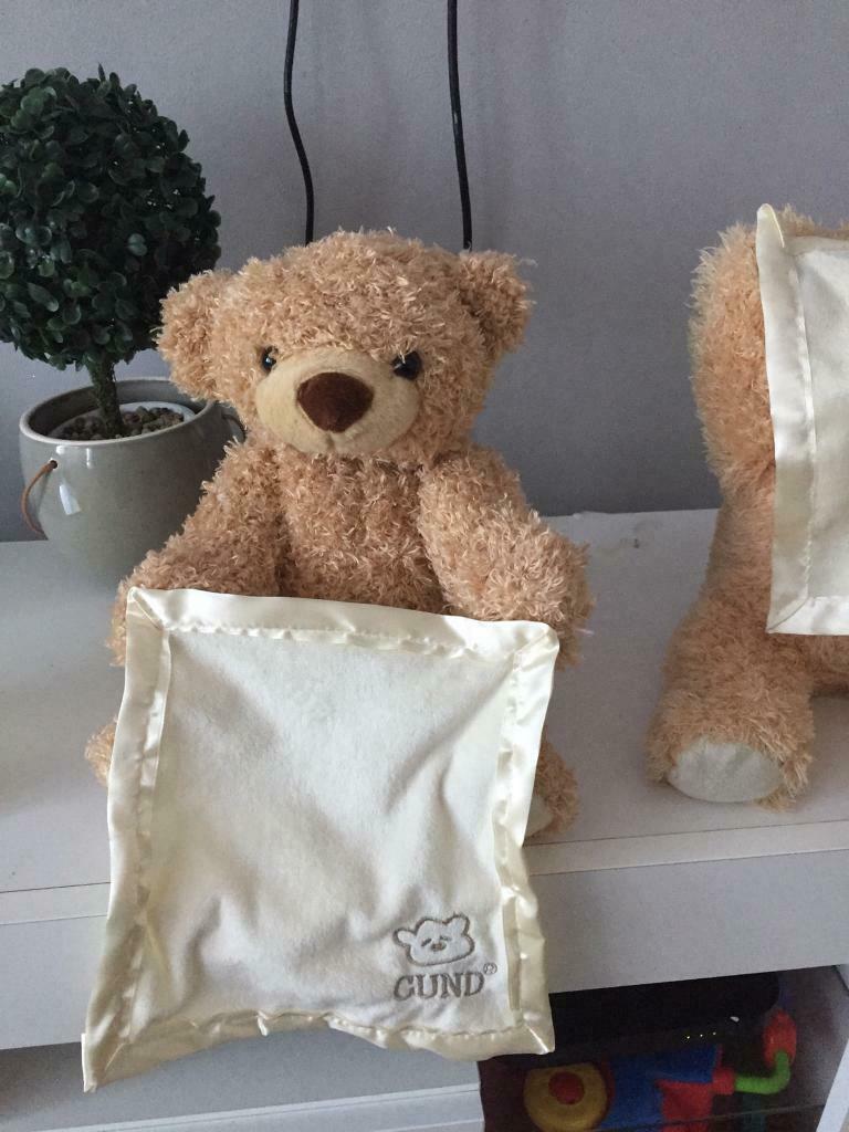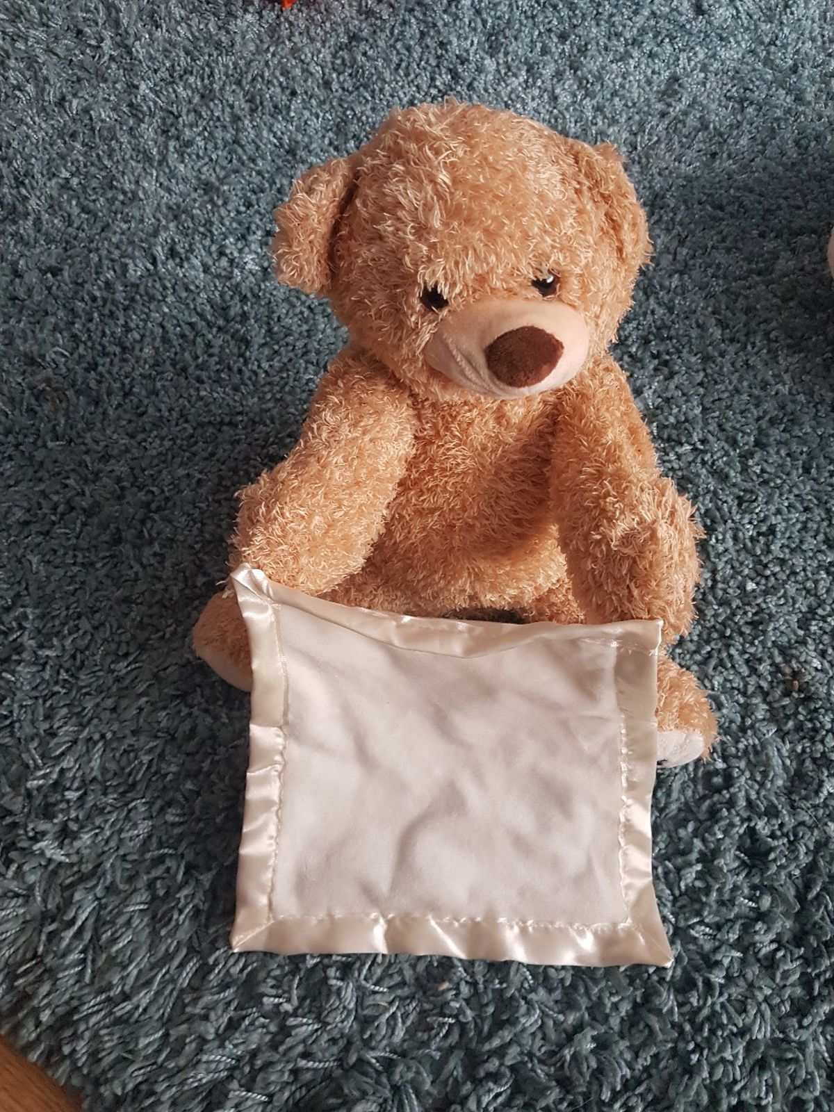 Add the perfect playtime companion to your baby’s collection of toys. Our super-soft Peek-a-Boo Bear Toy is ready to play peek-a-boo with his own warm, satin-detailed blanket. Keep your child entertained with a new furry friend that talks and moves.