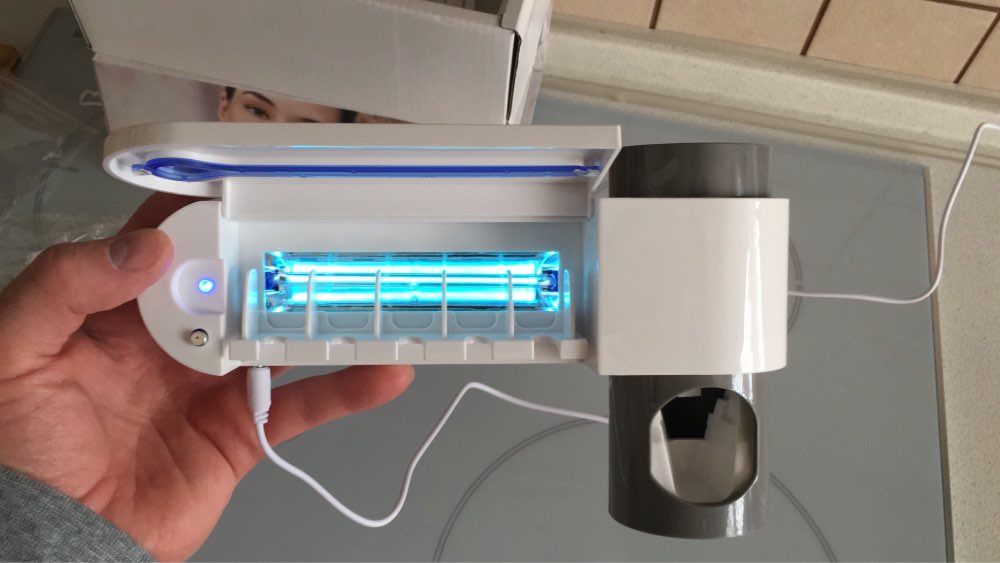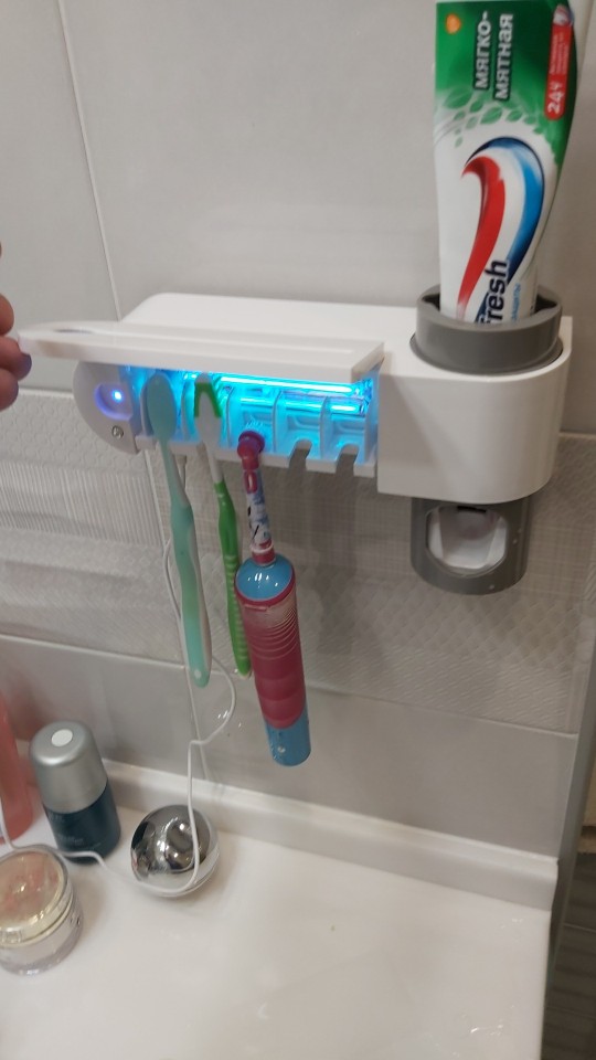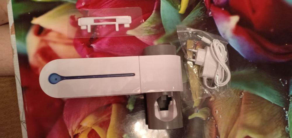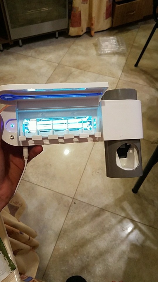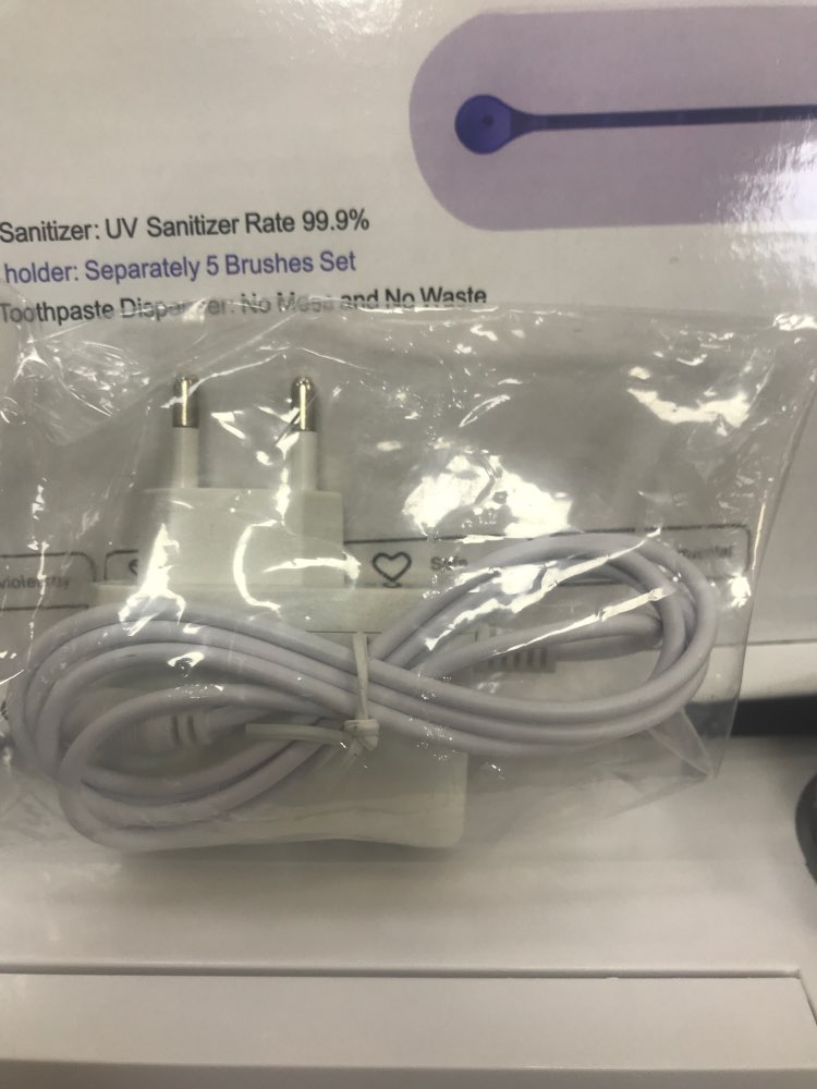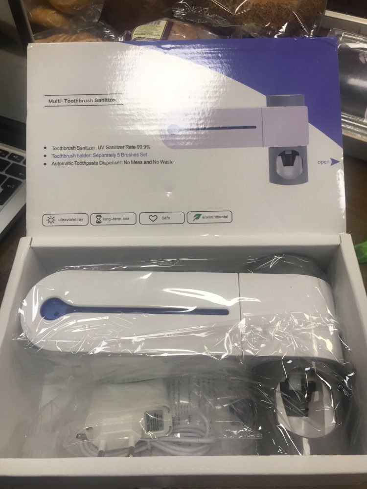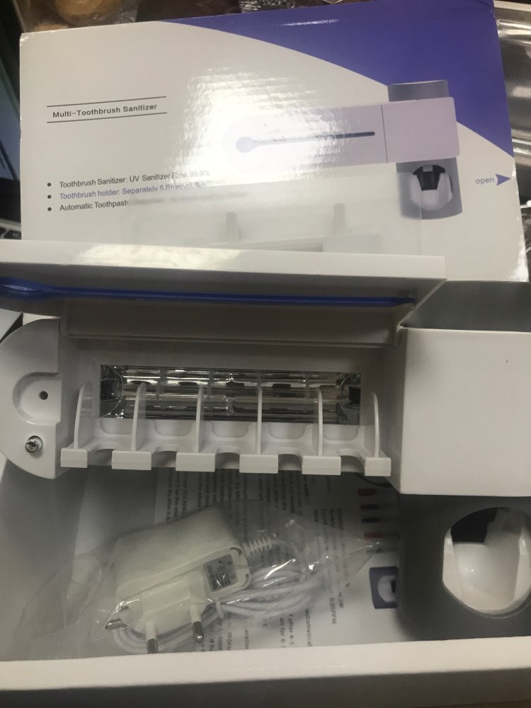 Thank you very much! Fully complies with the description. Came without a box, but in a powerful package. Everything works. As in reviews-after the work of the ultraviolet there is a characteristic smell. Plastic to the touch pleasant. Perfect holder for 5 brushes and pulling paste. It's true, it's necessary to set up the tube. Very nice looks in the bathroom. Wire with European plug-short-90 cm. I definitely recommend the store and the goods