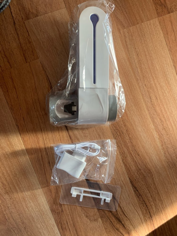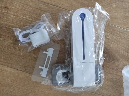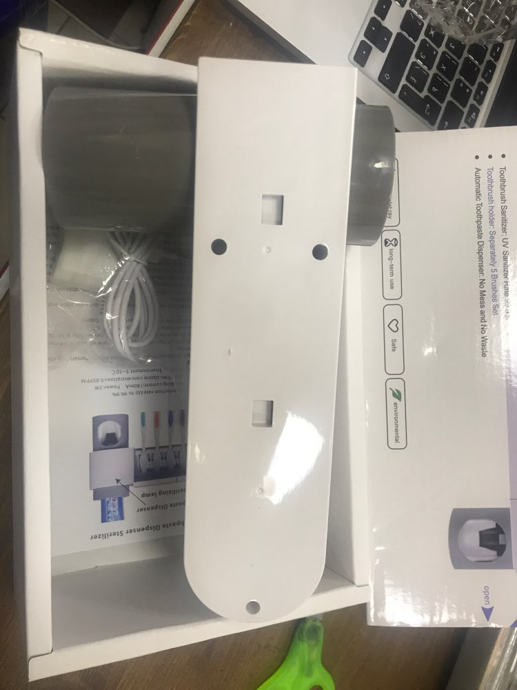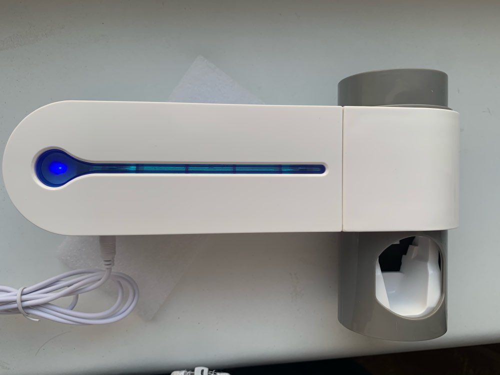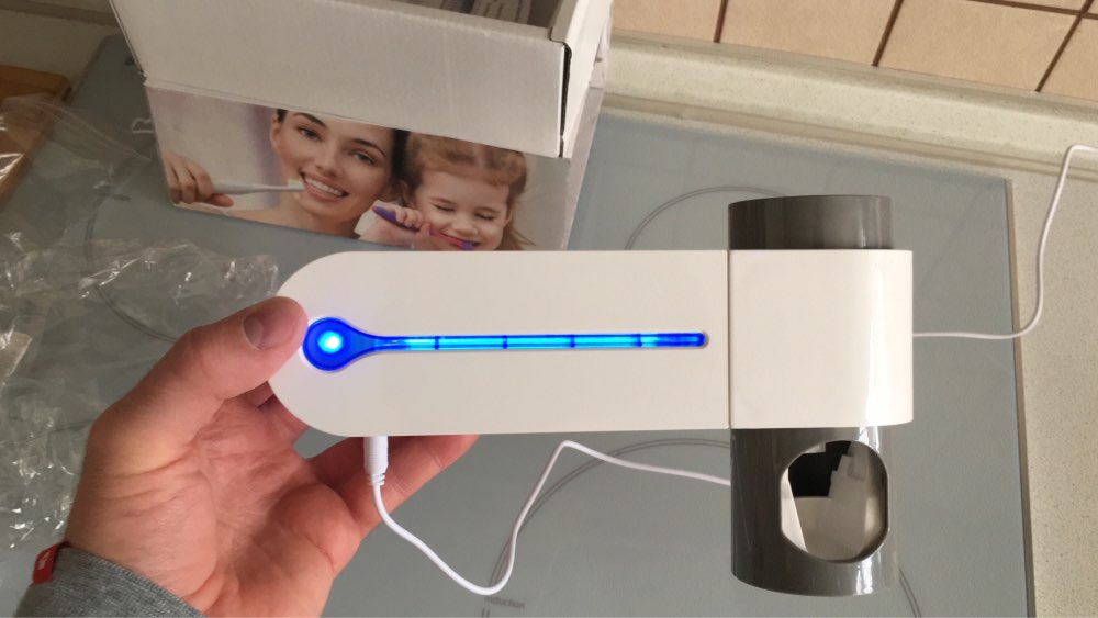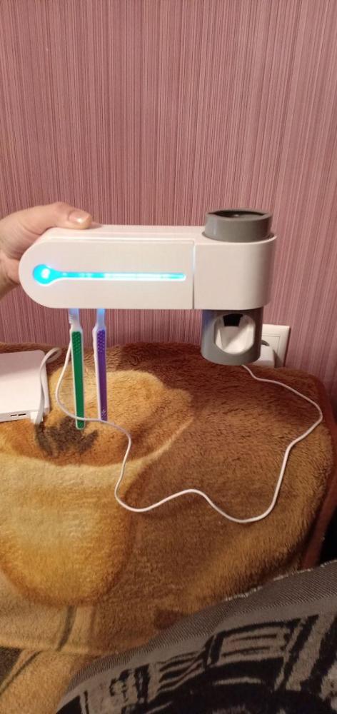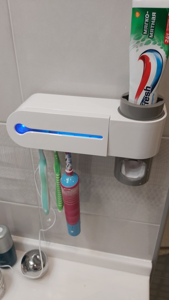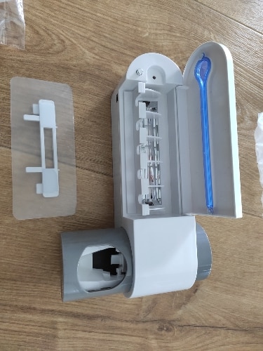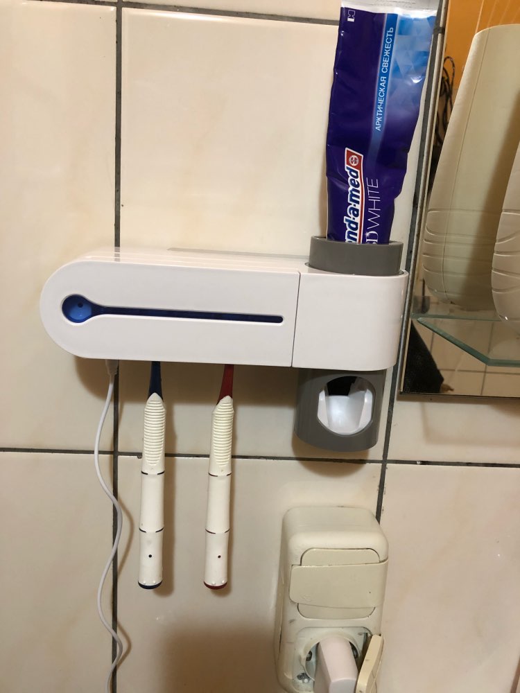 Thank you very much! Fully complies with the description. Came without a box, but in a powerful package. Everything works. As in reviews-after the work of the ultraviolet there is a characteristic smell. Plastic to the touch pleasant. Perfect holder for 5 brushes and pulling paste. It's true, it's necessary to set up the tube. Very nice looks in the bathroom. Wire with European plug-short-90 cm. I definitely recommend the store and the goods